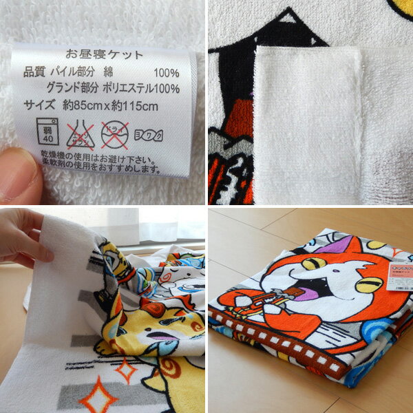 品名 妖怪ウォッチ お昼寝ケット 品番 151033 サイズ 85×115cm 素材 パイル部分:綿100% グランド部分:ポリエステル100% メーカー 国内メーカー 中国製 タグ表記 ※タンブラー乾燥機のご使用はお避け下さい。